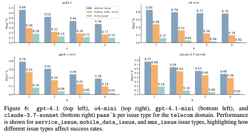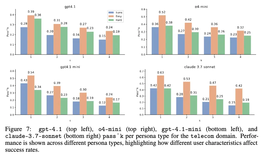 - SOTA 모델들도 해당 domain에서 상당한 어려움을 겪음. (pass@1 GPT-4.1: 34%, o4-mini: 42%, claude-3.7-sonnet: 49%)