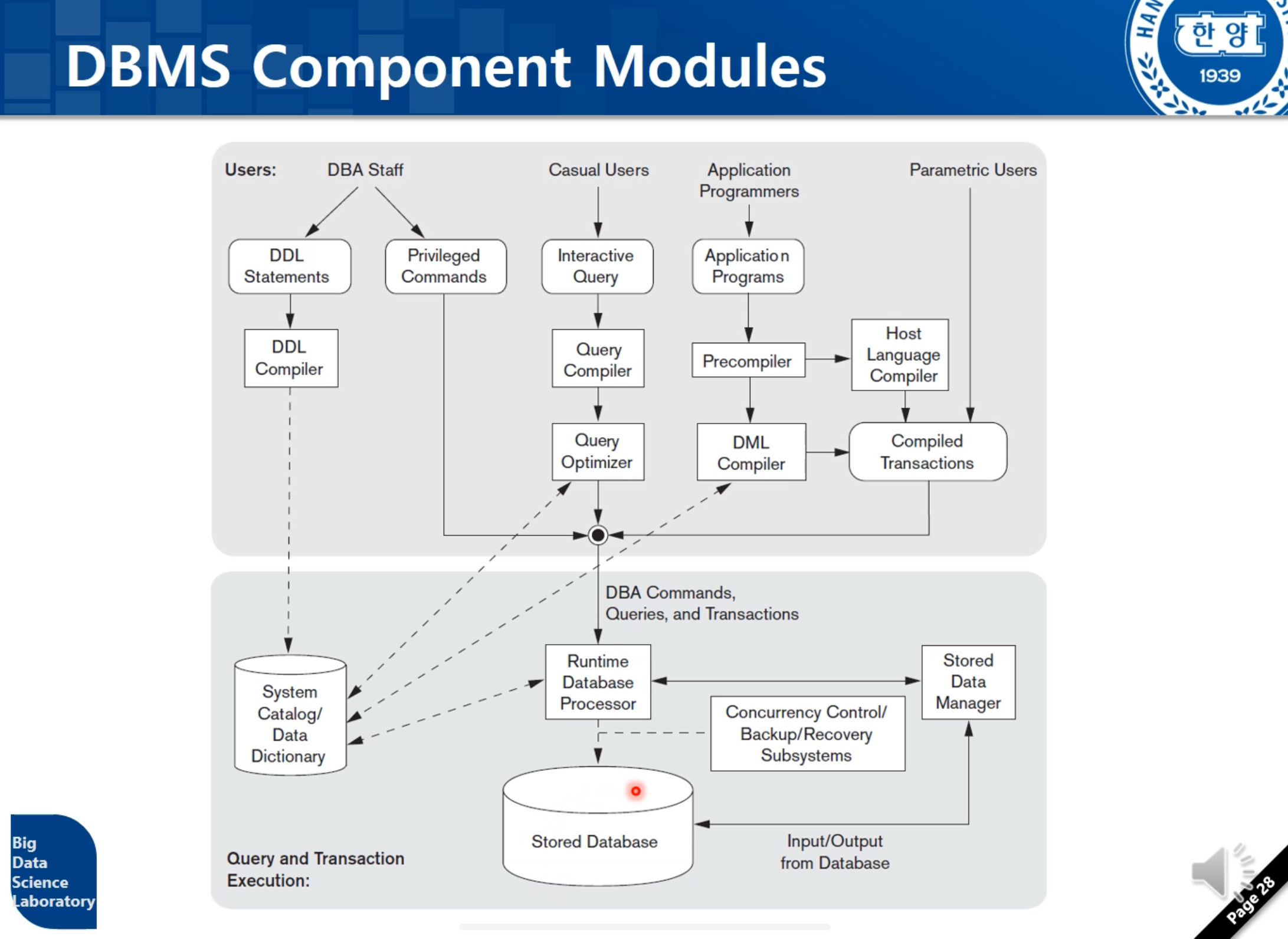· DDL Compiler(스키마를 다루는 language compiler): DDL에 의해서 만들어진 스키마를 처리하는 컴파일러