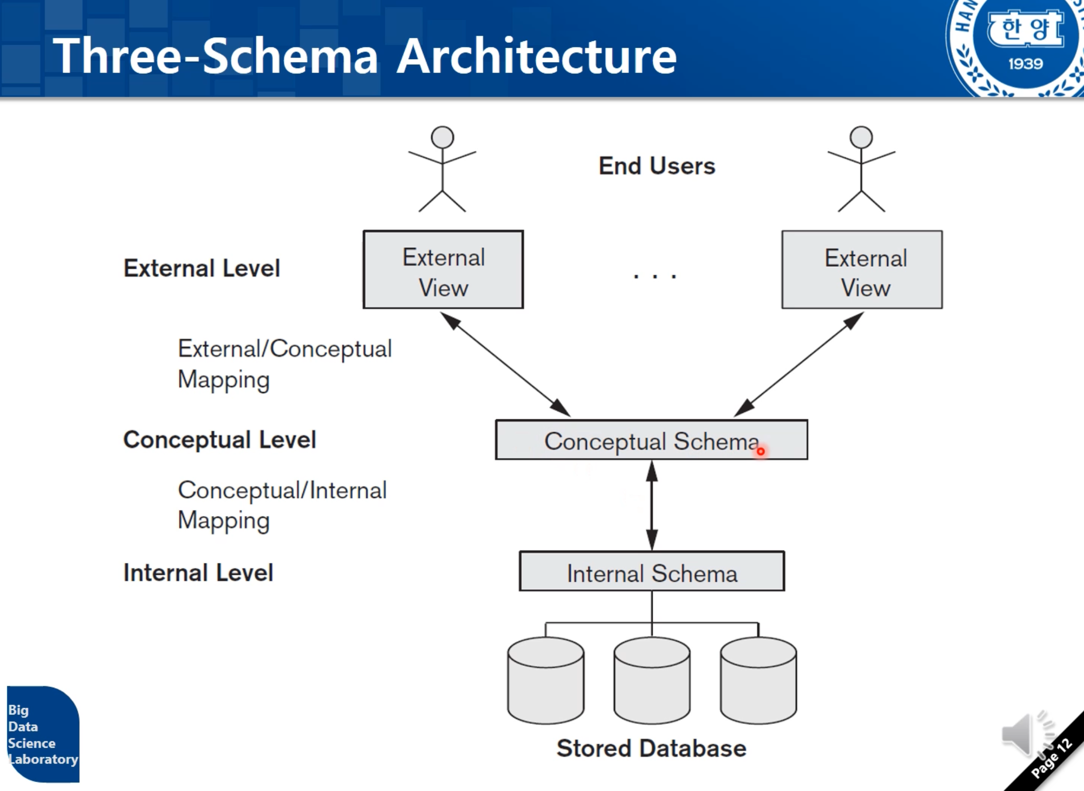 3) External View: 전체 데이터베이스 중 특정 사용자가 바라보는 view를 나타내는 스키마이다.