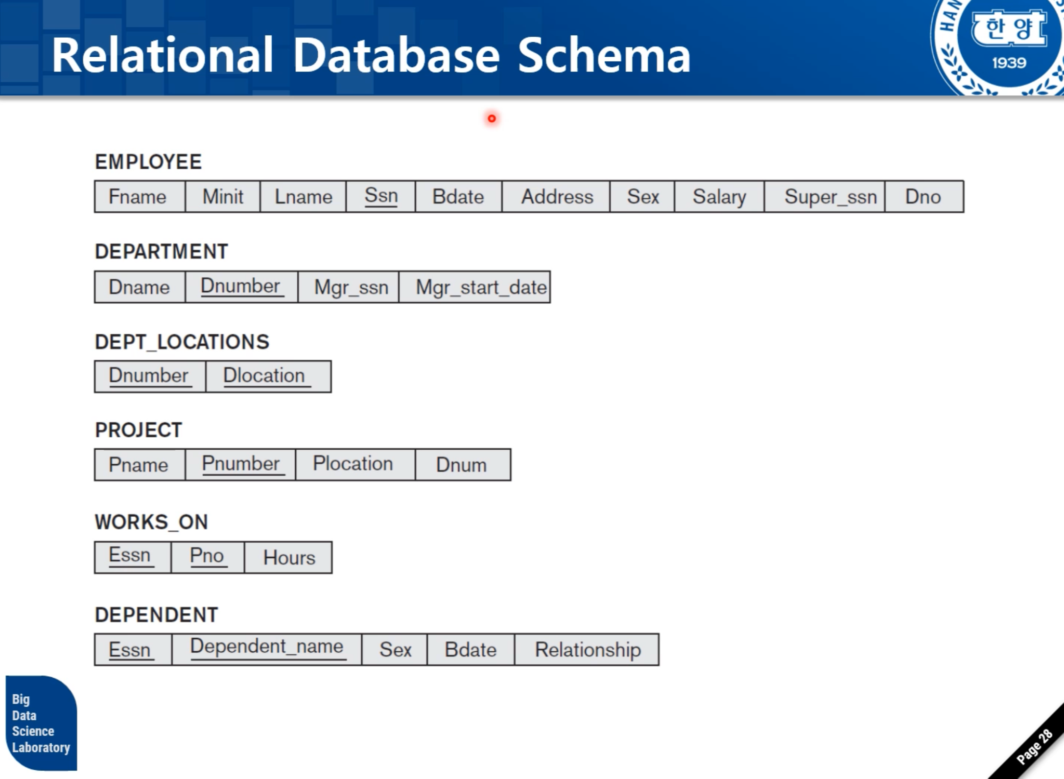 · Relation Schema(Table Schema) = Relation Name(Table Name) + Attribute들의 집합.