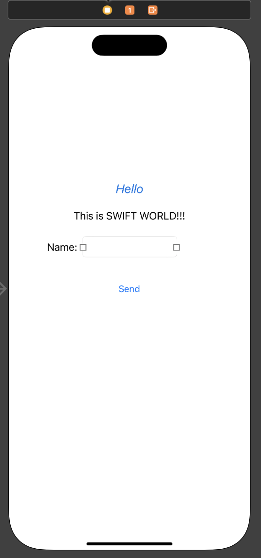 오른쪽 상단의 +를 눌러서 label을 추가하고 name 옆에는 텍스트 필드, Send 버튼을 추가한다. 클릭이 아니라 모두 드래그로 넣는다.