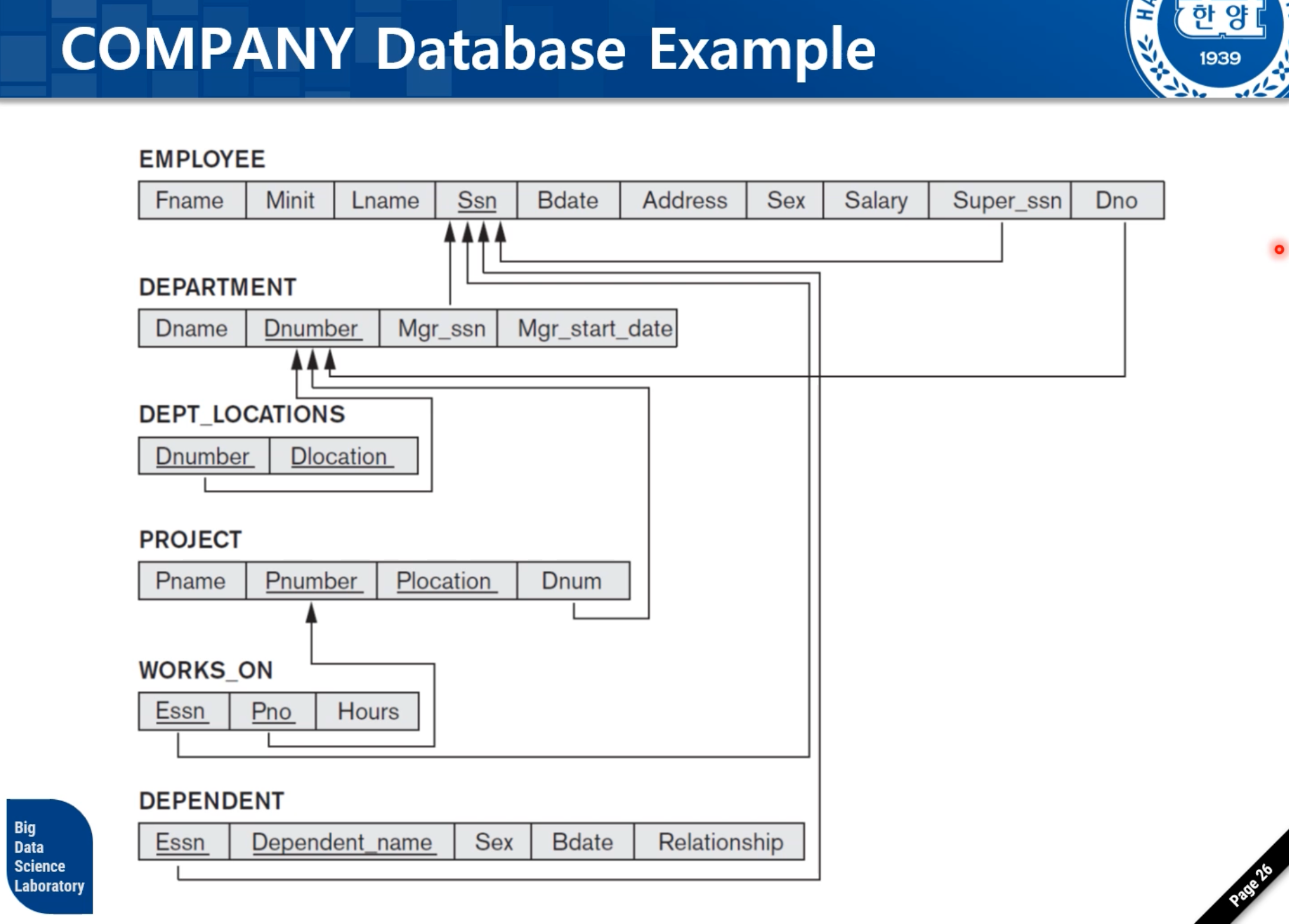 - EMPLOYEE의 PK를 DEPARTMENT의 FK로 가져온다. (Ssn as Mgr_ssn)