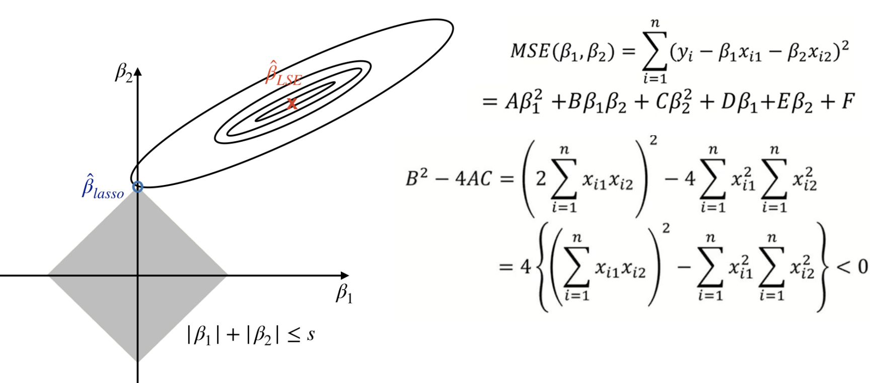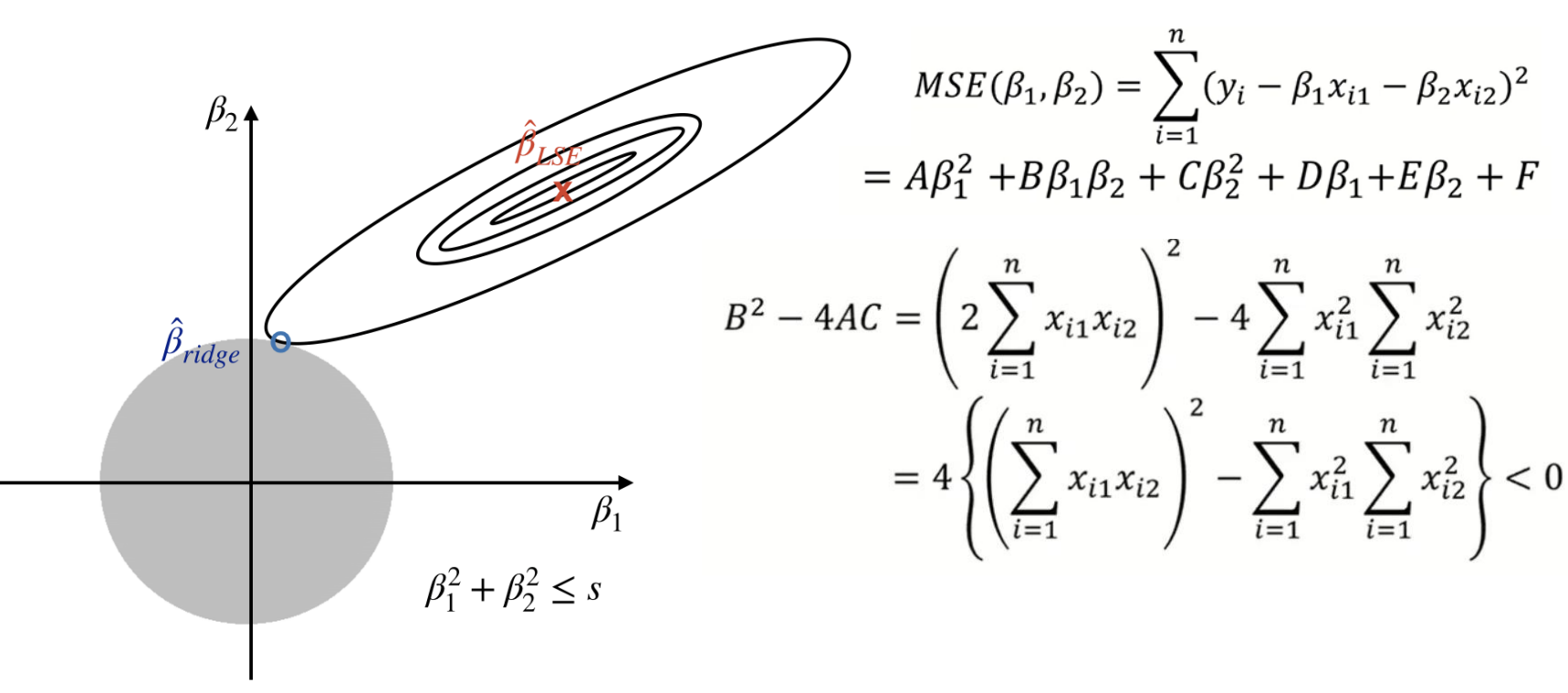 regularization term을 고려하지 않고 원래의 loss function은 $MSE(\beta_1, \beta_2)$ (mean squared error)이다. 위 그림 옆에 있는 식을 보면 loss function을 풀면 2차 곡선의 일반식이 도출된다. 2차 곡선은 판별식의 크기에 따라 타원, 쌍곡선, 포물선의 형태가 결정되는데 계산을 해보면 항상 0보다 작음을 확인할 수 있다. 판별식이 음수면 항상 타원이 그려진다. 따라서 regularization term은 원점을 중심으로 가지는 원으로 표현하고 loss function은 타원으로 그린다.