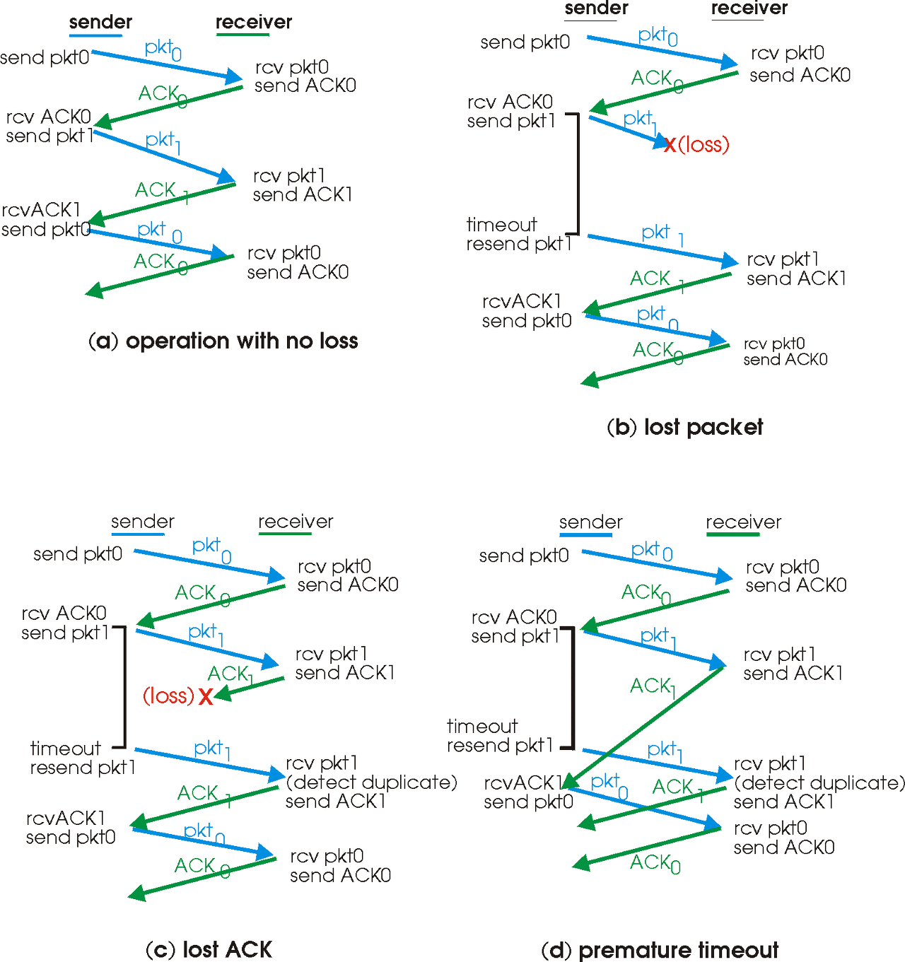 • 송신자가 데이터 패킷을 전송하고 패킷 또는 수신자의 패킷에 대한 ACK를 손실했다고 가정하자. 두 경우 모두 송신자에게는 어떠한 응답도 없다. 송신자 관점에서는 데이터 패킷이 손실되었는지, ACK가 손실되었는지, 패킷 또는 ACK가 단순히 지나치게 지연된 것인지를 알지 못한다. 이러한 모든 경우에서 송신자는 오직 재전송을 하면 된다. 시간 기반의 재전송 메커니즘을 위해 주어진 시간이 경과된 후에 송신자를 중단할 수 있는 카운트다운 타이머(countdown timer)를 설정한다.