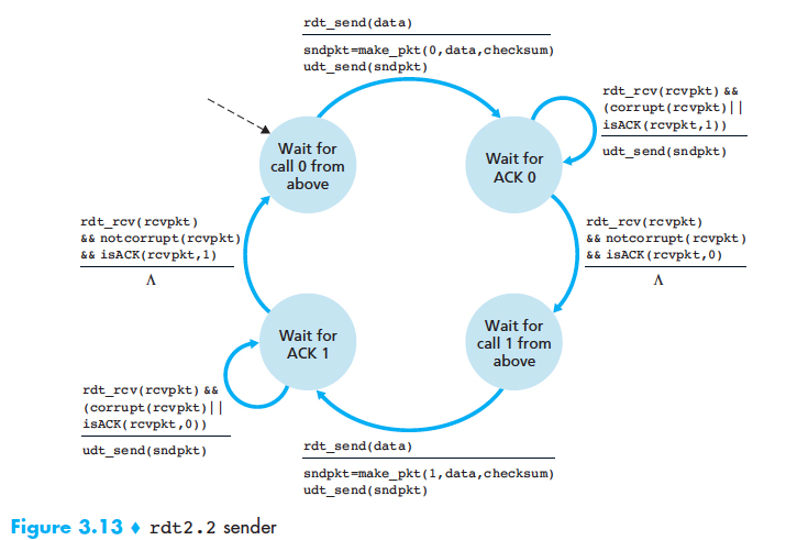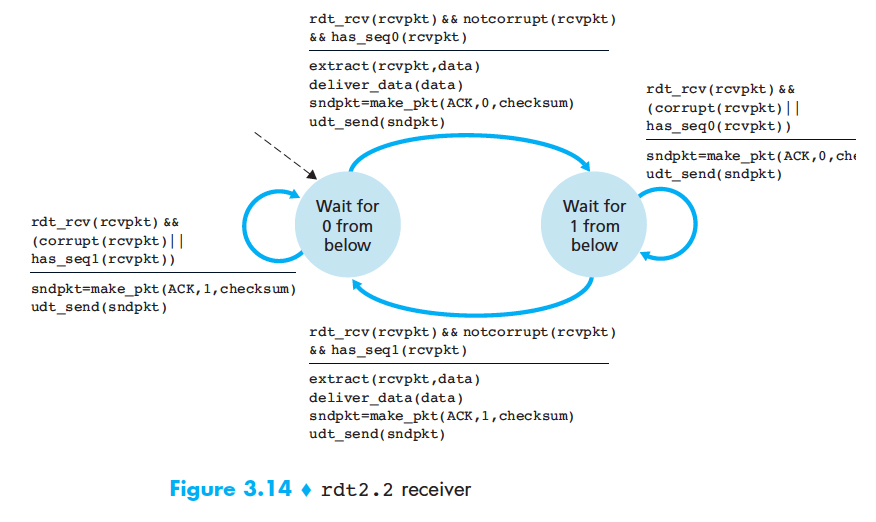 rdt2.1과 rdt2.2의 차이는 수신자가 NAK가 없기 때문에 반드시 ACK 메시지에 의해서 확인응답하는 패킷의 순서번호를 포함해야 한다는 것이다. 그리고 송신자는 수신된 ACK 메시지에 의해 확인응답된 패킷의 순서번호를 반드시 검사해야한다.