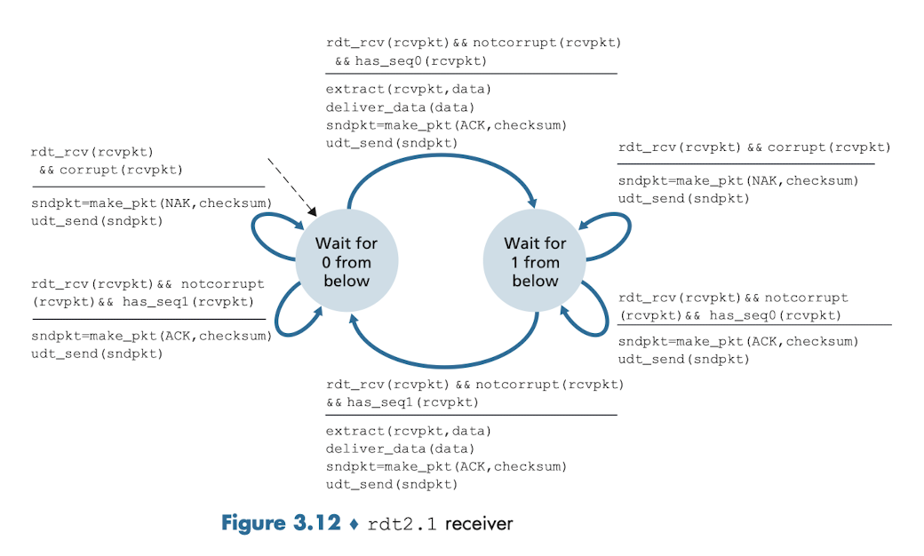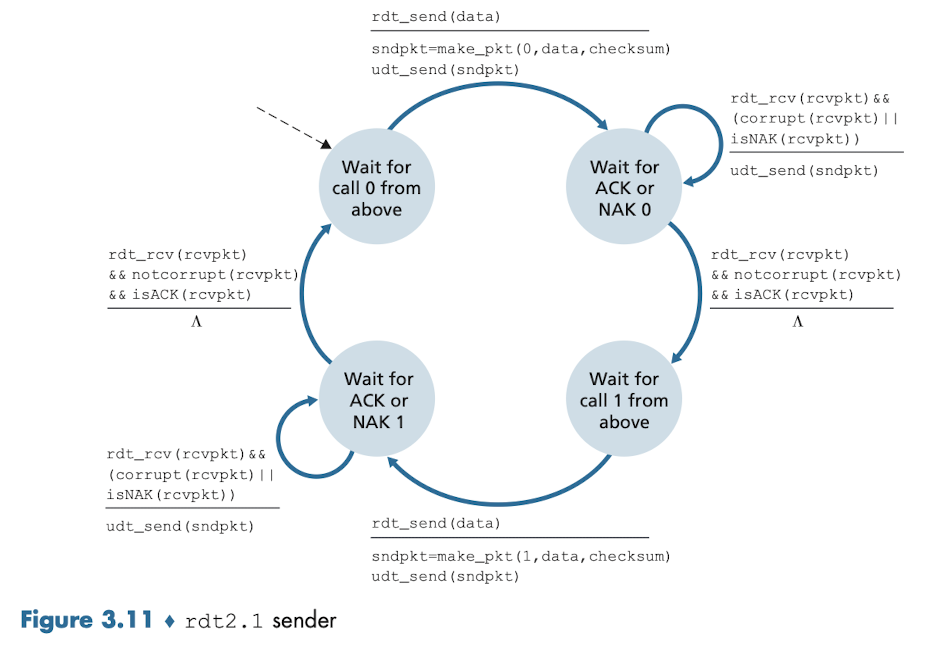 rdt2.1 송신자와 수신자 FSM 각각은 전송되고 있거나 기다리고 있는 패킷이 순서번호 0 또는 1을 가져야 하는지를 반영해야 하기 때문에 전보다 두 배 많은 상태를 가지고 있다.