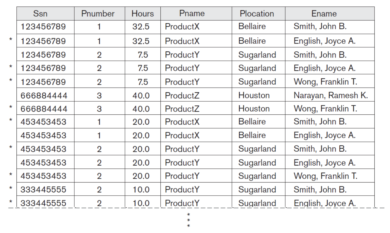 ▪ 하지만 옆에 별이 있는 tuple은 원래 tuple에 나타나지 않는 tuple이 나타난다. 실제로 해당 employee가 해당 project에서 일하지 않는데 location이 우연히 같아서 가짜 tuple이 나타나는 것이다. 두 테이블을 잘못 쪼개서 나타낸 table을 또 잘못 join해서 생기게 된다.