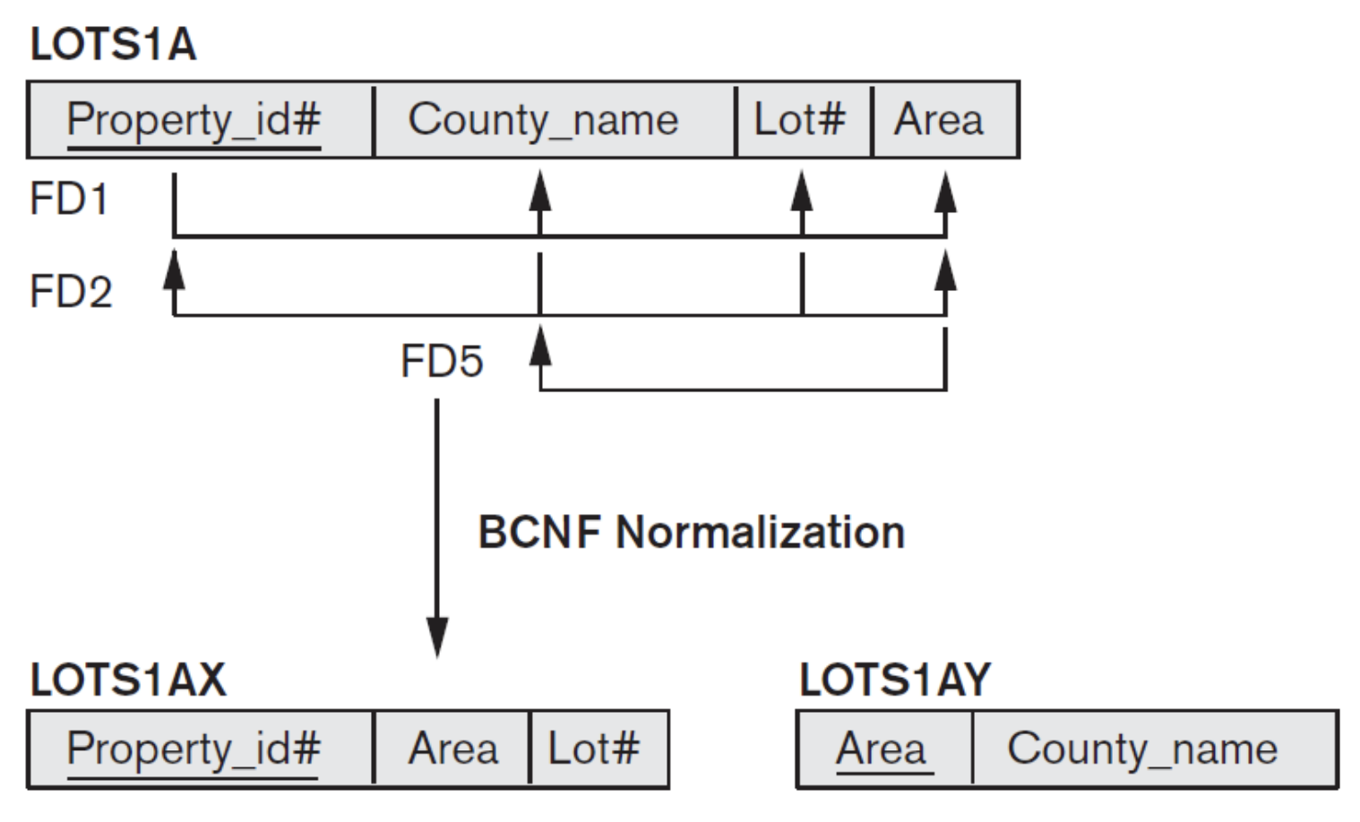 3NF은 주어진 FD에서 왼쪽에 있는 것이 superkey이거나 오른쪽에 있는 것이 prime attribute이어야한다. FD5은 왼쪽이 superkey가 아니기 때문에 BCNF가 아니다. 하지만 오른쪽에 있는 County_name이 prime attribute이기 때문에 3NF이다. 이를 BCNF로 만들기 위해서는 Area와 County_name을 빼서 새로운 table로 만들어야하고 오른쪽에 있는 County_name을 빼야한다. Area는 그대로 둬서 join attribute이 된다. 이렇게 쪼갬으로써 table이 BCNF가 되어 더 좋은 Normal form이 되었다. 문제는 FD2이다. 왼쪽의 것을 LOTS1AX, LOTS1AY에서 형성할 수 없기 때문에 항상 두 table을 join해서 FD2를 hold하는지 확인해야한다. 따라서 잃은 것은 functional dependency가 preserve되지 않는 점이다. 즉, effidency 측면에서 문제가 생긴다. 따라서 바람직한 형태를 3NF도 가능하다고 한 것이다.