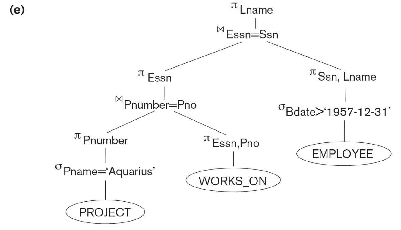 employee와 works_on을 cartesian product하고 그 결과를 다시 project와 cartesian product한다. 결과로 3개의 table이 모두 cartesian product된 굉장히 큰 table이 나온다. 거기서 Pname = 'Aquarius', Pnumber = Pno, Essn = ssn, Bdate > '1957-12-31'( 더 뒤에 나온 사람들 ) 이 조건을 만족시키는 것을 SELECT하고 Lname으로 project한다는 뜻이다. 즉, project name이 Aquarius인 project에 참여하는 employee 중 1957년 12월 31일 이후에 태어난 사람들의 이름을 알려달라는 뜻이다. 보통 이 query tree에 leaf node에 해당되는 것이 input relation이 된다. 가운데 나오는 internal node에 해당되는 것이 relational algebra operator이다. 이러한 query tree의 수행은 밑에서부터 relation이 있어야지만 처리할 수 있다.