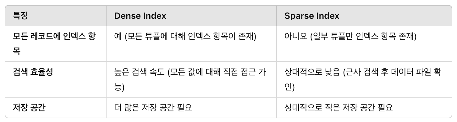 - dense index: 하나의 record마다 index가 하나씩 반드시 있는 것이다. record마다 index entry가 있어서 index를 보고 모든 record의 salary에 대한 정보를 알 수 있는 상황을 말한다.