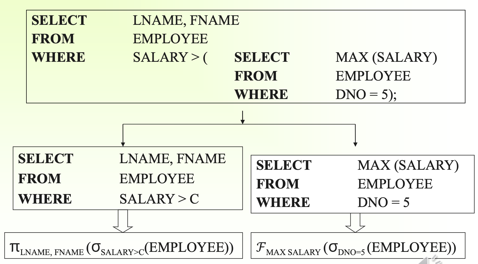 ▪ 두 query모두 query block이 된다. 이는 모두 relational algebra statement로 바꿀 수 있다. 5번인 것을 먼저 찾고 aggregate function을 적용해라. 연봉이 c보다 큰 employee를 찾아서 name으로 projection해라.