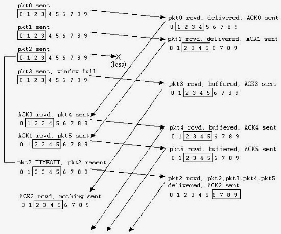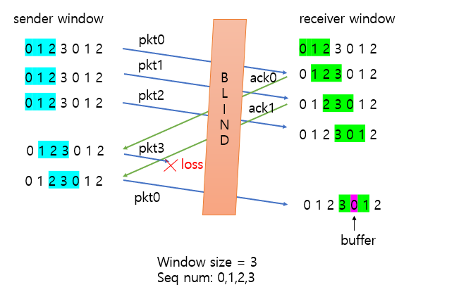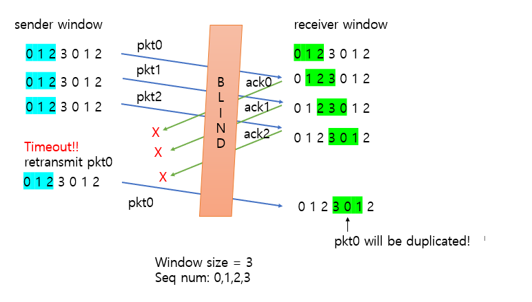 송신자와 수신자 윈도우 사이의 동기화의 부족은 순서번호의 한정된 범위에 직면했을 때 중대한 결과를 가져온다. 예를 들어, 한정된 범위의 네 패킷 순서번호 0, 1, 2, 3과 윈도우 크기 3에서 어떤 일이 일어날 수 있는가를 생각해보자. 0부터 2까지 패킷이 전송되어 올바로 수신되고 수신자에게서 확인이 되었다고 가정하자.