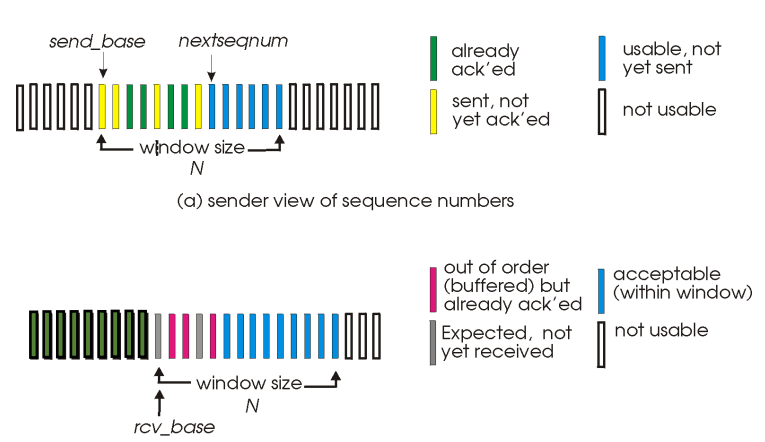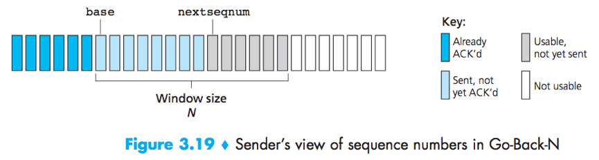 [nextseqnum, base+N-1]: 상위 계층으로부터 데이터가 도착하면 바로 전송될 수 있는 패킷
