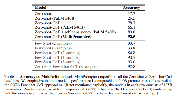 MathPrompter와 여러 baseline 모델의 성능을 비교한 결과이다. few-shot 및 zero-shot 학습 기반 접근법들의 결과가 포함되어있고 서로 다른 파라미터 수를 가진 모델의 결과를 제시하여 mathprompter의 중요성을 강조한다. 이는 175B(1750억) 파라미터 규모이다. 92.5%의 정확도를 보여주었으며 기존 SOTA 모델들에 비해 크게 향상된 결과이다.