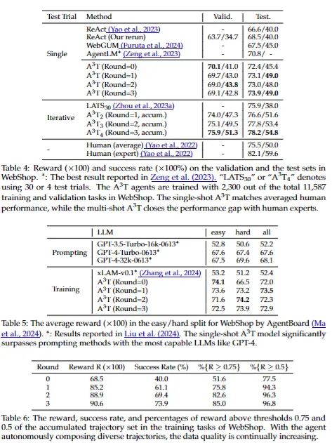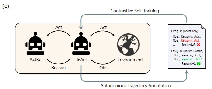 - ReAct 스타일의 agent는 실패한 작업에 대한 새로운 경로를 실행하고 성공시, 성공한 경로로 저장. 이는 기존 실패 경로와 비교해서 (contrastive learning)으로 self-training