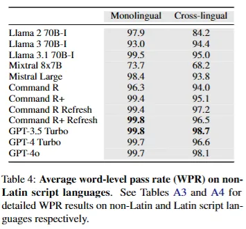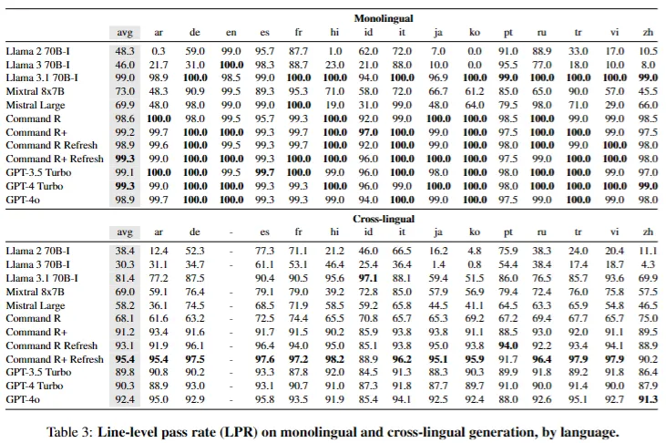 - Command R, OpenAI 계열 모델은 monolingual에서는 훨씬 좋은 성능을 보였지만, cross-lingual에서는 가장 강력한 모델조차도 언어를 정확히 유지하지 못하는 경우가 있었음.