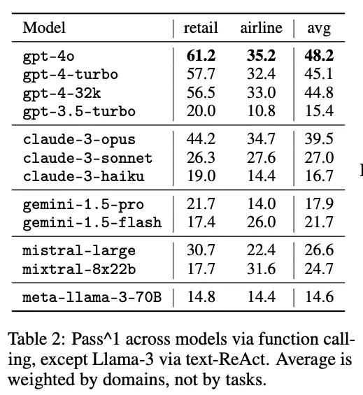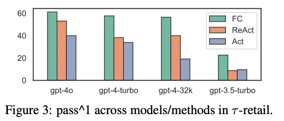- GPT-4o조차도 function calling만 사용했을 때 τ-retail에서는 약 61%, τ-airline에서는 약 35% 성능을 보임.