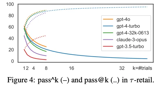 - τ-retail에서 pass^8 기준 성공률은 25% 수준까지 떨어짐.