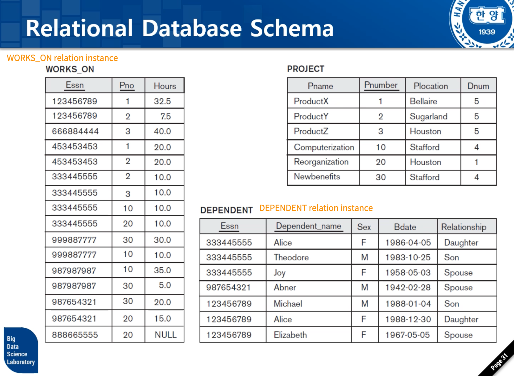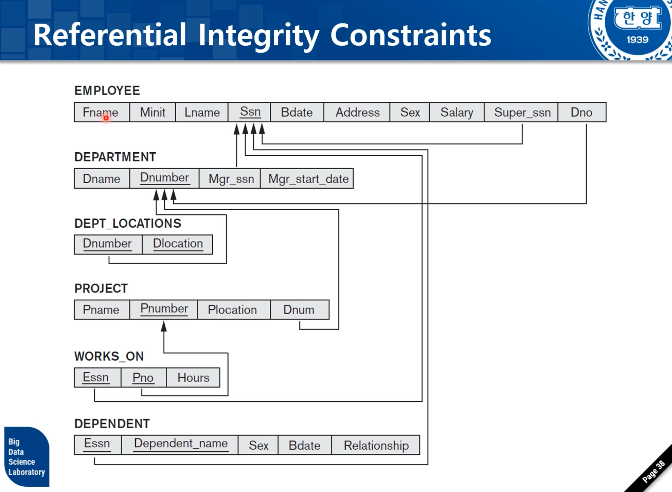 ex) EMPLOYEE에 있는 DNO attribute는 DEPARTMENT에 있는 존재하는 Dnumber를 참조해야한다.