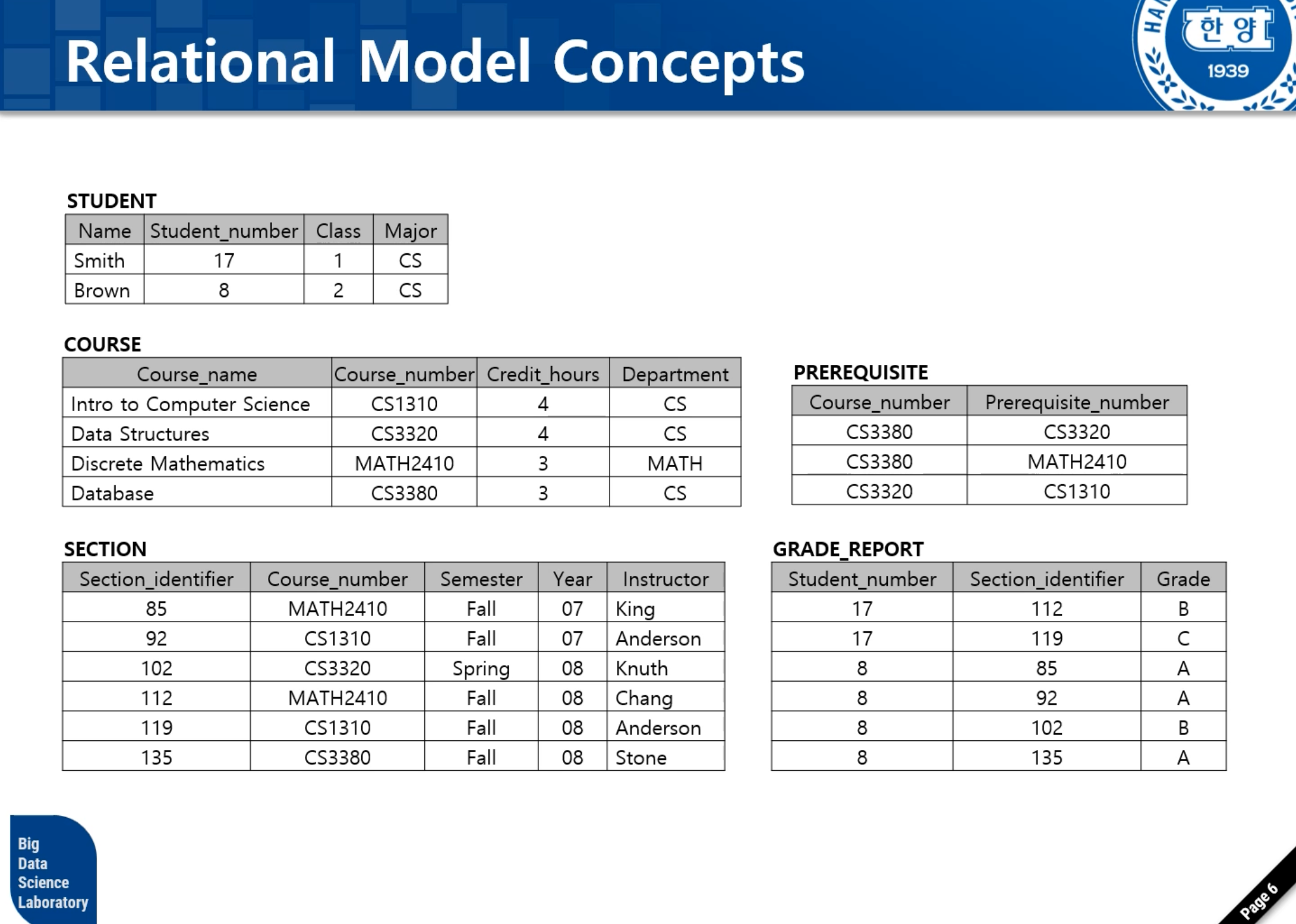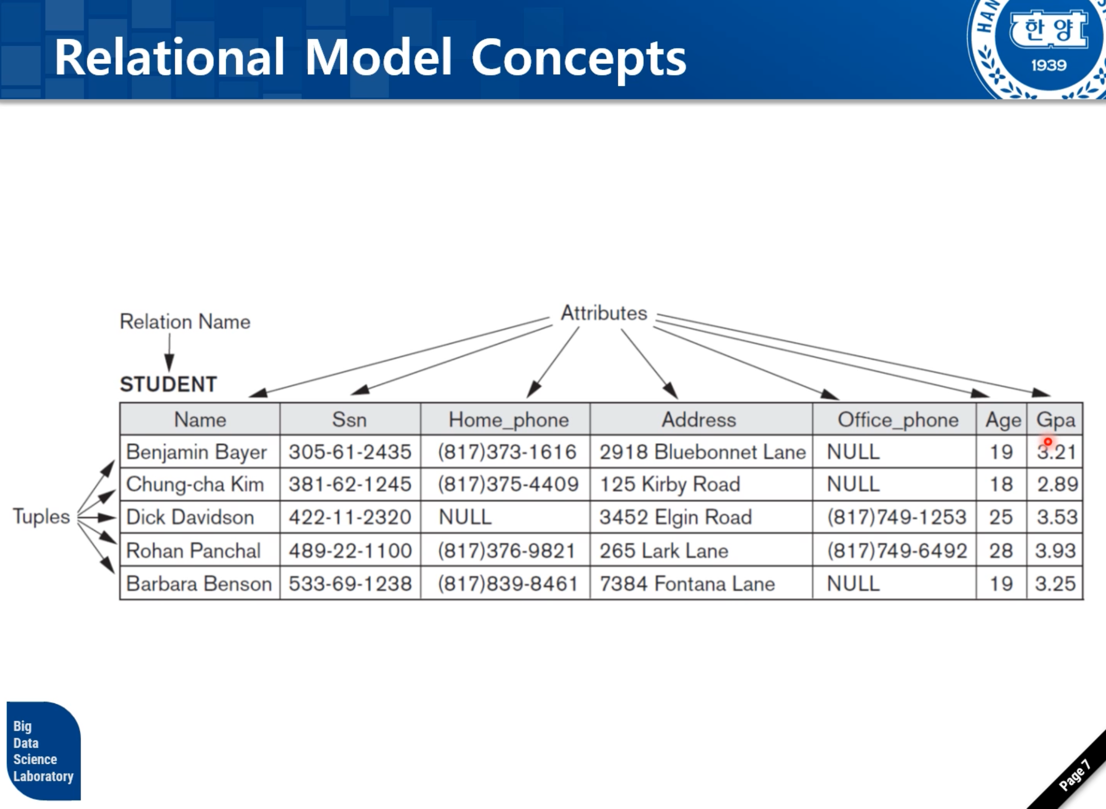 각 tuple은 실세계에 존재하는 entity나 relationship을 표현하고 하나의 tuple에는 여러 attribute value들로 이루어진다.