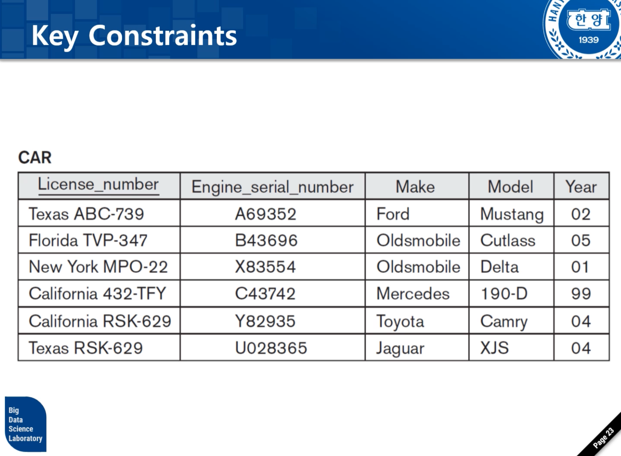 1) Key Constraints: 하나의 테이블 내에는 candidate key가 존재해야만 한다.