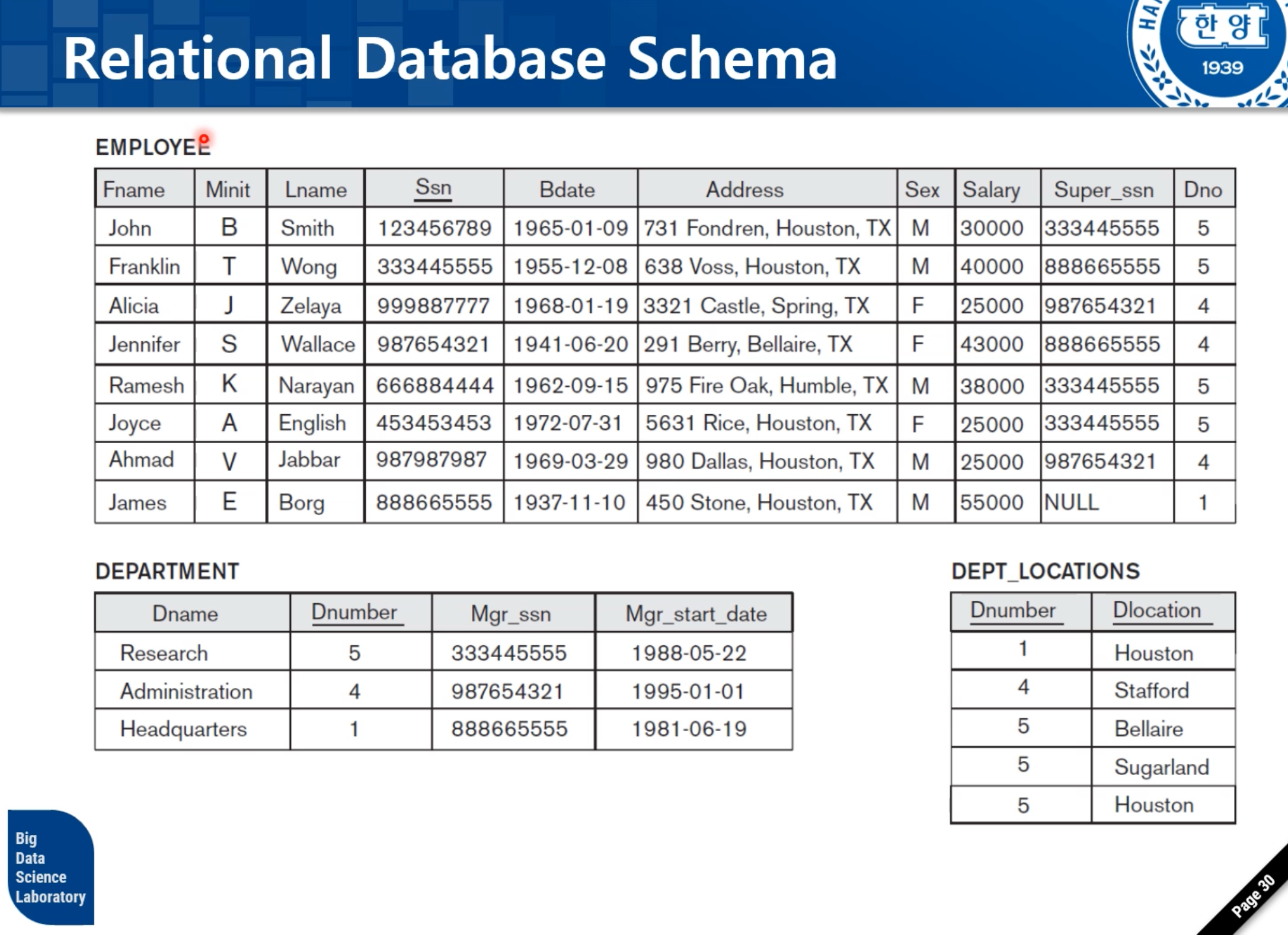 ex) employee의 dno가 foreign key이고 dno값은 department의 primary key인 dnumber 중 하나여야 한다. 어떤 employee의 DNO가 NULL인 것은 이 사람은 아직 발령을 받지 못했다는 뜻이다.