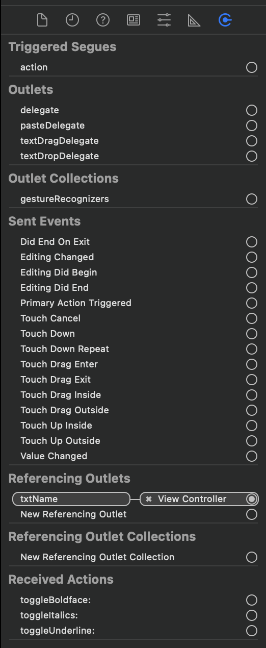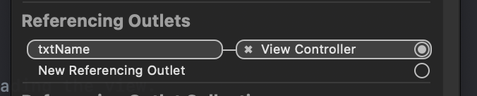 ex. 텍스트 필드에 사용자가 이름을 입력하면 입력한 텍스트를 받아 저장할 변수를 만들고 만든 변수와 텍스트 필드를 연결해줘야한다. 이러한 변수를 아웃렛 변수(Outlet Variable)이라 한다.